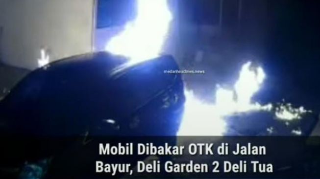 Dilihat dari rekaman CCTV, mobil berwarna hitam itu dibakar oleh seseorang diduga menggunakan bensin.