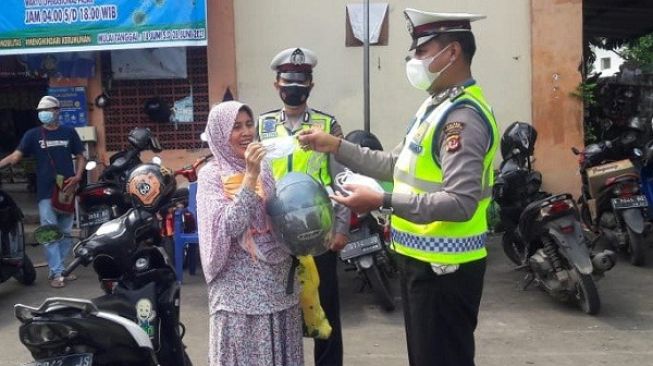 KEJAKSAN, fajarsatu – Unit Kamsel Sat Lantas Polres Cirebon Kota (Ciko) melaksanakan edukasi protokol kesehatan (prokes) dengan membagikan masker kepada masyarakat yang beraktifitas di Jalan Diponegoro, Kelurahan Kesenden, kecamatan Kejaksan, Kota Cirebon, Minggu (27/6/2021).