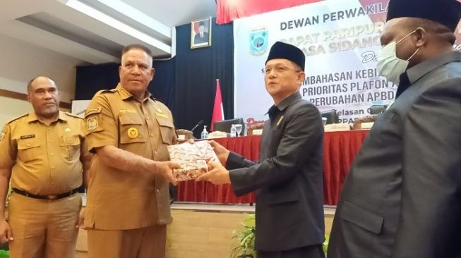 DPR Papua Barat Terlambat Bahas KUA-PPAS APBD Perubahan 2022, Ini Penyebabnya “Rapat kali ini sangat mengalami keterlambatan untuk proses pembahasannya yang sedianya harus dibahas pada Juli tetapi baru dapat dibahas pada September ini,” ucap Ranley, Senin malam. PROVINSI PAPUA BARAT By Redaksi On 27 Sep 2022 Penjabat Gubernur Papua Barat Komjen Pol (Purn) Drs. Paulus Waterpauw M.Si menyerahkan dokumen kepada DPR-PB dalam rapat Pembahasan KUA-PPAS APBD Perubahan 2022, (KabarPapua.co/Irsye Simbar) 180 Share