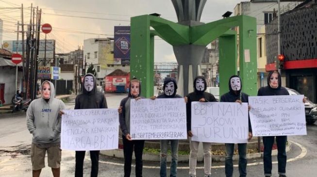 Sekelompok orang bertopeng bjorka dan anonymous melakukan aksi turun ke jalan di Tugu Asmaul Husna Jalan HZ Mustofa Kota Tasikmalaya.