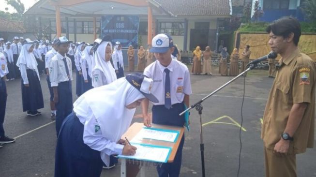 Pantauan kapol.id khususnya di SMP Negeri 2 Tanjungkerta Kabupaten Sumedang, para siswa melaksanakan upacara bendera sekaligus pelantikan pengurus OSIS.