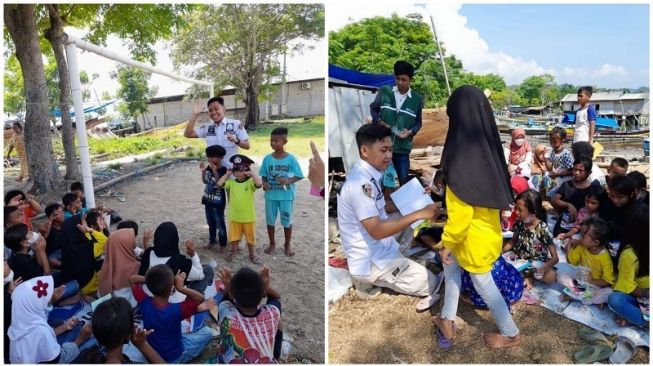 Aksi Bripda Berliyansyah saat menjadi guru di Sekolah Partikelir, Minggu (31/10/2021). LAMPUNGPRO.CO/POLDA LAMPUNG