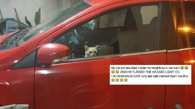 Pemilik kucing pintar itu merasa geli ketika ayahnya mengirim foto-foto kucingnya, Oyen, mengintip ke luar jendela sedan merah tetangga mereka, dikutip dari AsiaOne, 28 Desember 2019.