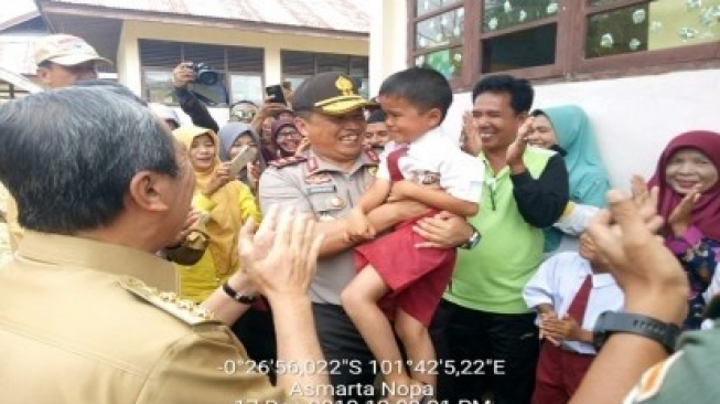 RIAU ONLINE, TELUK KUANTAN - Kapolda Riau Irjen Pol Agung Setya Imam Effendi menyalurkan bantuan sebanyak 1 Ton beras untuk korban banjir di Kabupaten Kuansing, Riau, Selasa, 17 Desember 2019.