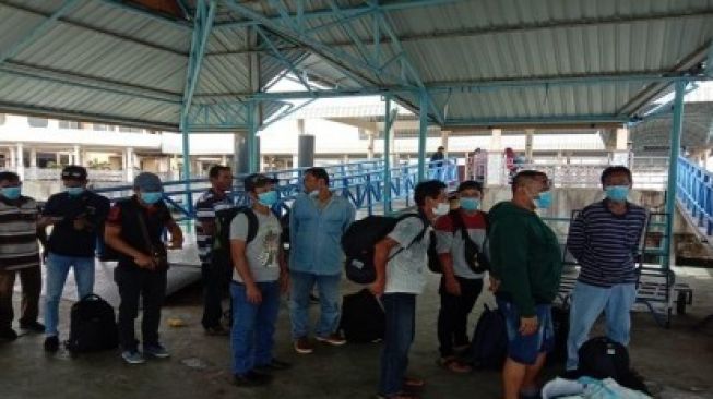 RIAU ONLINE, BENGKALIS - Puluhan Warga Negara Indonesia (WNI) dari Malaysia yang pulang melalui jalur Tanjung Balai Karimun, tiba di Bengkalis, Senin 23 Maret 2020, di Pelabuhan Bandar Sri Laksamana (BSL), Jalan Sudirman, Kota Bengkalis.