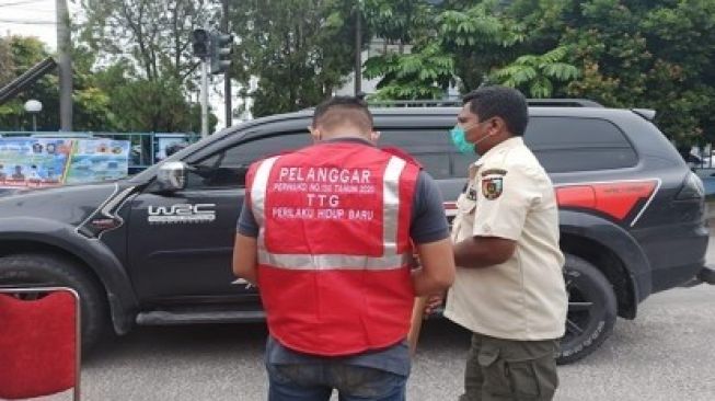 RIAU ONLINE, PEKANBARU - Jajaran Satuan Tugas (Satgas) Covid-19 Pekanbaru bersama kecamatan Sukajadi, Pekanbaru menggelar razia masker kepada pengendara kendaraan di depan kantor Migrasi jalan Teratai Ahmad Dahlan, Pekanbaru, Kamis, 22 Oktober 2020.