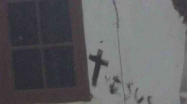 Coretan itu berwarna hitam. Lambang salib cukup terlihat, namun tulisan Yesus samar-samar di tembok dekat jendela.