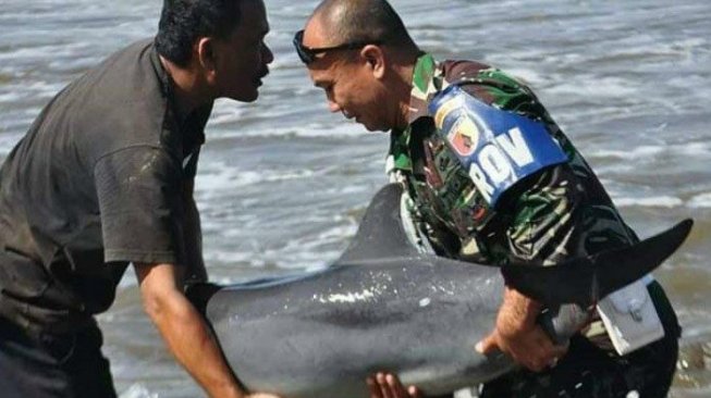 Seorang anggota TNI berseragam provost yanng sedang mengevakuasi seekor lumba-lumba yang terdampar di pantai. Ramai jadi perbincangan kalayak ramai di Tulungagung.