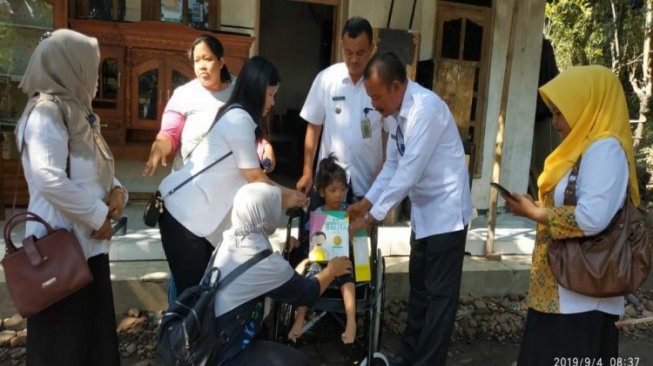 Dua bocah penyandang disabilitas di Kecamatan Suboh, Kabupaten Situbondo, Jawa Timur, Rabu (4/9/2019) tersenyum sumringah. Pasalnya, mereka mendapat bantuan kursi roda dari DTSI (Dokter dan Tenaga Sosial Indonesia) perwakilan Situbondo.