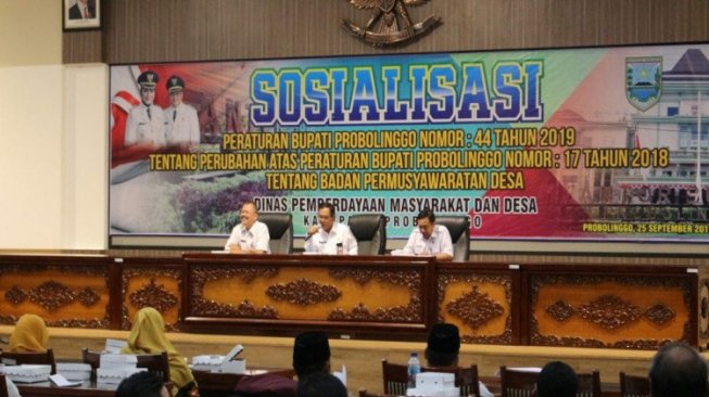 Dinas Pemberdayaan Masyarakat dan Desa (DPMD) Kabupaten Probolinggo mengelar sosialisasi tentang Peraturan Bupati (Perbub) Probolinggo Nomor 44 tahun 2019 tentang perubahan atas peraturan Bupati Probolinggo Nomor 17 tahun 2018 Tentang Badan Permusyawaratan Desa (BPD) di Kantor Bupati Probolinggo Auditorium Madakaripura. Rabu (25/9/2019).