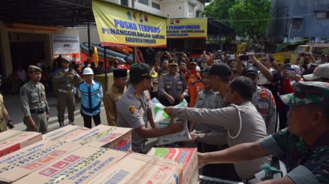 Usai apel kesiapan, Kapolres Pamekasan, AKBP Djoko Lestari, didampingi Pejabat Utama (PJU) Polres Pamekasan berikan bantuan logistik kepada perwakilan personel yang berjaga di Posko Terpadu Penanggulangan Bencana yang berada Kantor BPBD.
