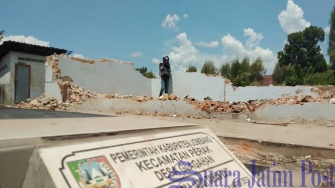 JOMBANG, - Tidak ada angin, tidak ada hujan, sebuah bangunan tua yang dibangun pada tahun 1976, milik Pemerintahan Desa Glagah, Kecamatan Perak, Kabupaten Jombang, kemarin Sabtu 15/2, sekira pukul 17.00 Wib, ambruk.