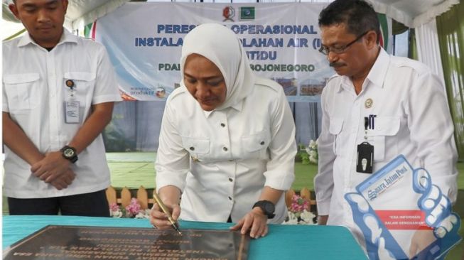 BOJONEGORO- Bupati Bojonegoro Anna Mu'awanah meresmikan Operasional Instalasi Pengelolaan Air (IPA) IKK Kalitidu, Rabu (18/03).