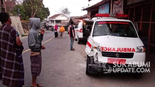 Mobil ambulans bernopol F 9943 V milik Desa Caringinnunggal, Kecamatan Waluran, Kabupaten Sukabumi, mengalami kecelakaan saat membawa Jenazah. Ambulans tersebut menabrak tembok pondasi rumah di Cigaru, Desa Kertajaya, Kecamatan Simpenan, Kamis (26/9/2019) dini hari.
