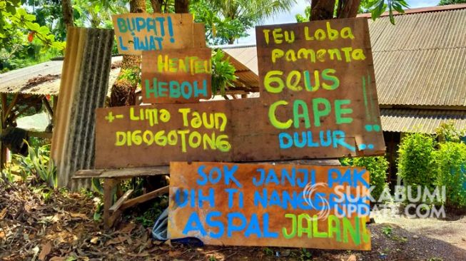 SUKABUMIUPDATE.com - Warga Kampung Cisampi Desa Bojongjengkol, Kecamatan Jampang Tengah, Kabupaten Sukabumi meluapkan kekesalan soal jalan rusak dengan cara yang unik. Warga menuliskan kalimat-kalimat sindiran di sebuah papan triplek bekas yang dicat warna-warni.