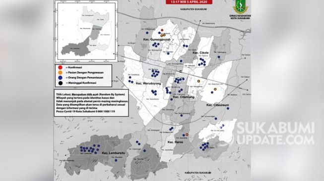 Dari peta sebaran Covid-19 Dinas Kesehatan Kota Sukabumi pada hari Minggu 5 April 2020 pukul 13.17 WIB, satu pasien positif Corona (hasil swap test) berada di Kelurahan Karamat, Kecamatan Gunungpuyuh, Kota Sukabumi.