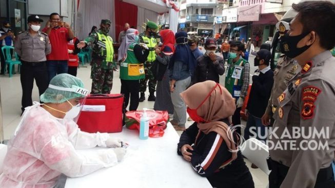 Rapid test digelar di pelataran Citymall, dengan menerjunkan unit labkesda Dinas Kesehatan Kota Sukabumi. Empat petugas dengan alat pelindung diri (APD) lengkap, akan mengambil 100 sampel darah warga yang berada di lokasi tersebut secara acak, khususnya pedagang dan pembeli.