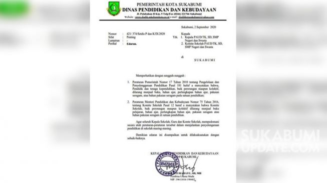 Surat tertanggal 2 September 2020 yang ditandatangani Kadisdik Nike Siti Rahayu itu kembali mencuat usai mahasiswa yang tergabung dalam Himpunan Mahasiswa Islam (HMI) Cabang Sukabumi mendatangi kantor Disdik Kota Sukabumi, Kamis (17/9/2020) kemarin.