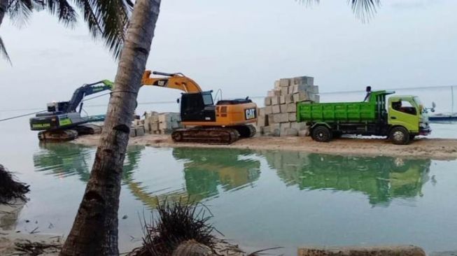 Pengerjaan proyek di lapangan oleh PT Pinar Jaya Perkasa ini melakukan pengerukan di garis pantai untuk menyusun gugus beton.