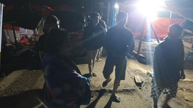 Warga di tempat pengungsian Pontang-panting menyelamatkan diri saat gempa susulan mengguncang kembali wilayah Cianjur, Jawa Barat.
