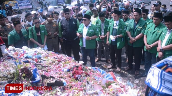 TIMESINDONESIA – GP Ansor Kabupaten Malang melakukan tabur bunga dan doa bersama bagi korban Tragedi Stadion Kanjuruhan. Doa bersama dilakukan di Patung Singa, Stadion Kanjuruhan, Kepanjen, Kabupaten Malang, Selasa, (4/10/2022).