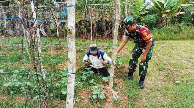 Pendampingan ketahanan pangan kepada para petani di wilayah binaanya, Babinsa Koramil 420-04/Sarolangun Kopda Heki Marsa Putra membantu petani membersihkan gulma dan merawat kebun timun milik Pak Ali (45) di Desa Suka Jadi Kecamatan Bathin VIII Kabupaten Sarolangun, Selasa (25/10/2022).