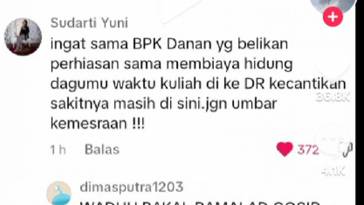 "Ingat sama bapak Danan yang belikan perhiasan sama membiayai hidung, dagumu waktu kuliah ke dokter kecantikan. Sakitnya masih di sini, jangan umbar kemesraan!" kata Sudarti Yuni mengutip dari unggahan ulang akun TikTok @bukanfansmu3.